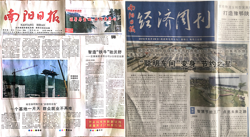 從智能制造到清潔生產(chǎn)、節(jié)能減排,一月內(nèi)《南陽日報》于8月11日、、8月29日連續(xù)兩次報道亞澳農(nóng)機,河南衛(wèi)視《新聞聯(lián)播》聯(lián)動報道。