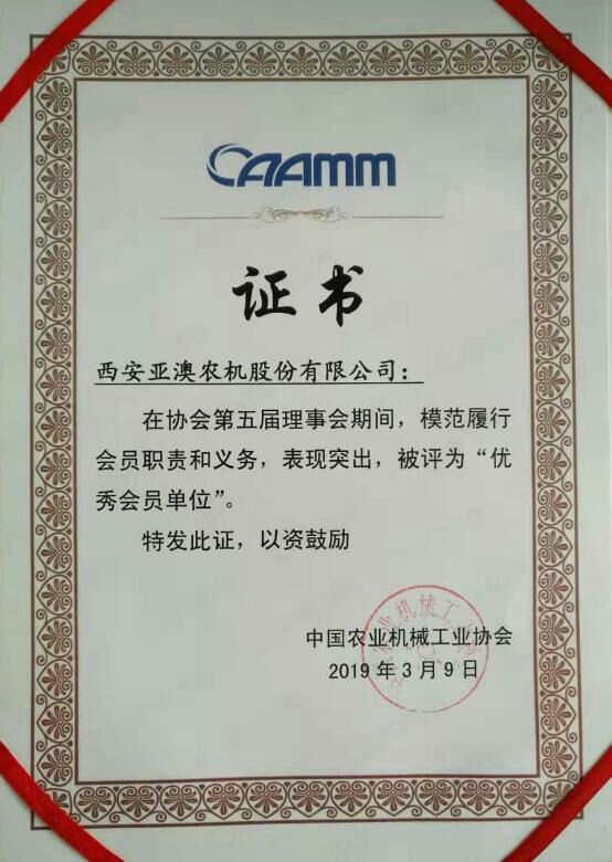 大會(huì)宣讀了中國機(jī)械工業(yè)聯(lián)合會(huì)《關(guān)于中國農(nóng)業(yè)機(jī)械工業(yè)協(xié)會(huì)理事會(huì)換屆的批復(fù)》。審議通過了陳志會(huì)長代表協(xié)會(huì)第五屆理事會(huì)作的《中國農(nóng)機(jī)工業(yè)協(xié)會(huì)第五屆理事會(huì)工作報(bào)告》和侯慶忠執(zhí)行副會(huì)長作的《中國農(nóng)機(jī)工業(yè)協(xié)會(huì)第五屆理事會(huì)財(cái)務(wù)收支情況報(bào)告》,審議通過了《中國農(nóng)業(yè)機(jī)械工業(yè)協(xié)會(huì)章程》,選舉產(chǎn)生了中國農(nóng)業(yè)機(jī)械工業(yè)協(xié)會(huì)第六屆理事會(huì)和第一屆監(jiān)事會(huì)。 為表彰協(xié)會(huì)五屆理事會(huì)履職以來,為推進(jìn)農(nóng)機(jī)工業(yè)技術(shù)進(jìn)步和健康發(fā)展做出積極貢獻(xiàn)的優(yōu)秀集體和個(gè)人,會(huì)議還授予侯慶忠等10人為“優(yōu)秀協(xié)會(huì)工作者”,授予企業(yè)管理委員會(huì)等5個(gè)分支機(jī)構(gòu)為“先進(jìn)分支機(jī)構(gòu)”,授予西安亞澳農(nóng)機(jī)股份有限公司等33家單位為“優(yōu)秀會(huì)員單位”。 亞澳農(nóng)機(jī)總經(jīng)理史森強(qiáng)應(yīng)邀參會(huì)并參加相關(guān)活動(dòng)。榮獲“優(yōu)秀會(huì)員單位”是協(xié)會(huì)對(duì)亞澳多年來投身農(nóng)機(jī)事業(yè)的充分肯定和高度認(rèn)可,亞澳也將以此為契機(jī),不忘初心、篤定前行,為促進(jìn)我國農(nóng)機(jī)產(chǎn)業(yè)轉(zhuǎn)型升級(jí),推動(dòng)我國農(nóng)業(yè)全程全面機(jī)械化做出新的更大貢獻(xiàn)。